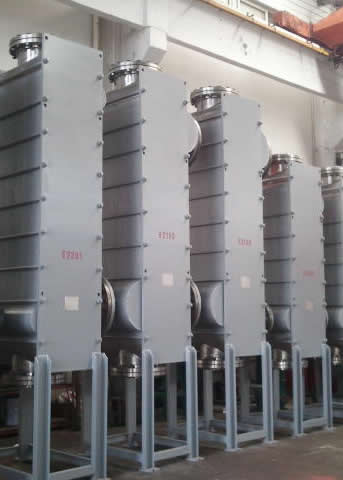 BRQ系列全焊型板式换热器(冷凝器)是一组相邻金属波纹片以180度交角交替排列后对合焊接组成板片束,与端板封头等零件装配而成。此系列设备上下封头可拆卸,用于检查一侧板片通道与焊缝,